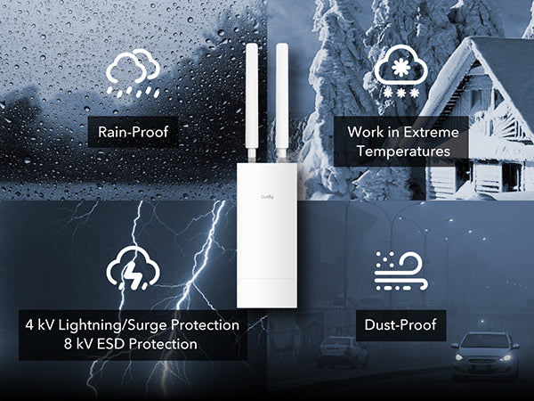 A pole/wall-mounted WiFi AP with IP65 casing, PoE, and Cudy Mesh features, ideal for park, farm, and parking lot environments.