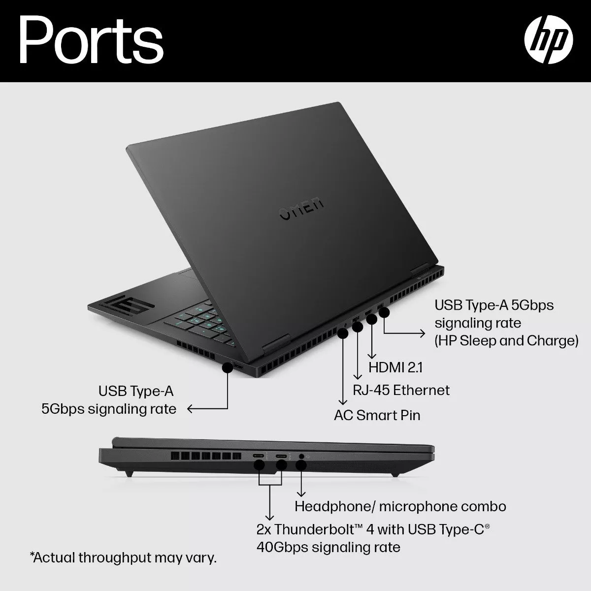 • Ports: 1 x USB Type-A 5Gbps signaling rate; 1 x USB Type-A 5Gbps signaling rate (HP Sleep and Charge); 2 x USB Type-C® 10Gbps signaling rate (USB Power Delivery, DisplayPort™ 1.4a, HP Sleep and Charge); 1 x HDMI 2.1; 1 RJ-45; 1 x AC smart pin; 1 x headphone/microphone combo