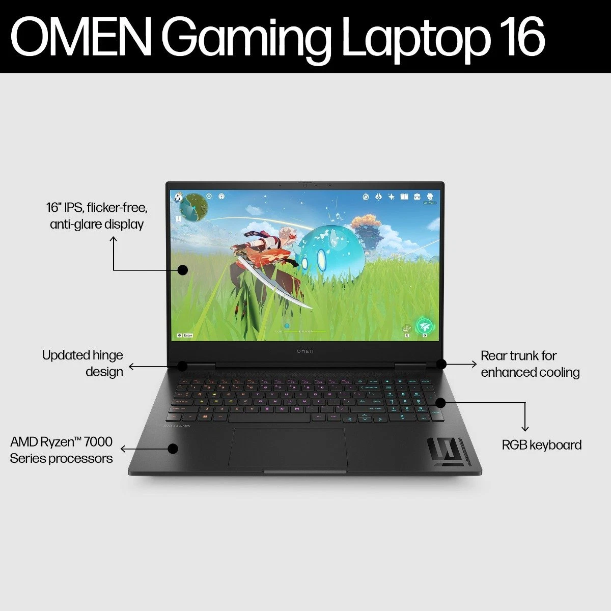 The OMEN 16 inch gaming laptop is ready to go wherever you are. Enjoy desktop-level power with a 7000 Series AMD Ryzen 9 processor and a modern graphics card, both regulated by enhanced internal cooling. The screen is equally impressive with high resolution, smooth framerates, and anti-glare features.