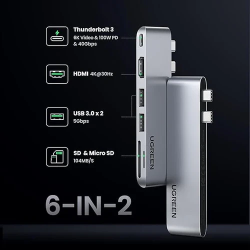 UGREEN 6-in-2 USB-C Adapter – HDMI, USB 3.0, SD/TF Slots & More
